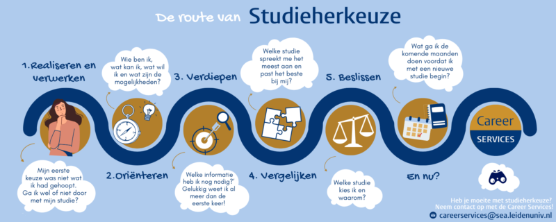 De studiekeuzeadviseur van jouw facultaire Career Service kan je verder helpen met je studie(her)keuzevragen. Samen bespreken jullie jouw huidige studiekeuze en hoe je je, indien nodig, kunt oriënteren op een nieuwe studie. Met de studiekeuzeadviseur breng je je twijfels en situatie in kaart en ga je dieper in op je studie(her)keuze.